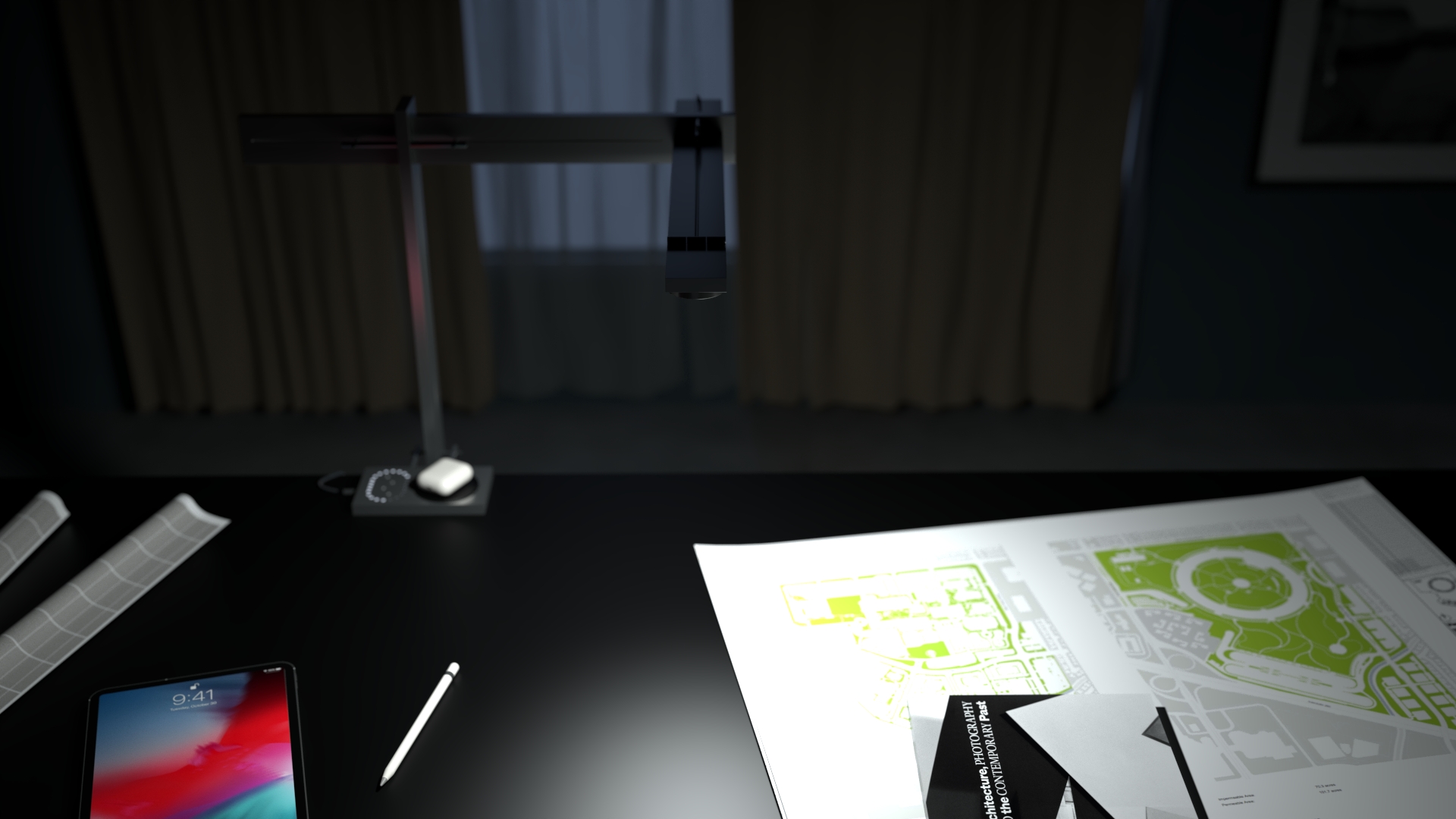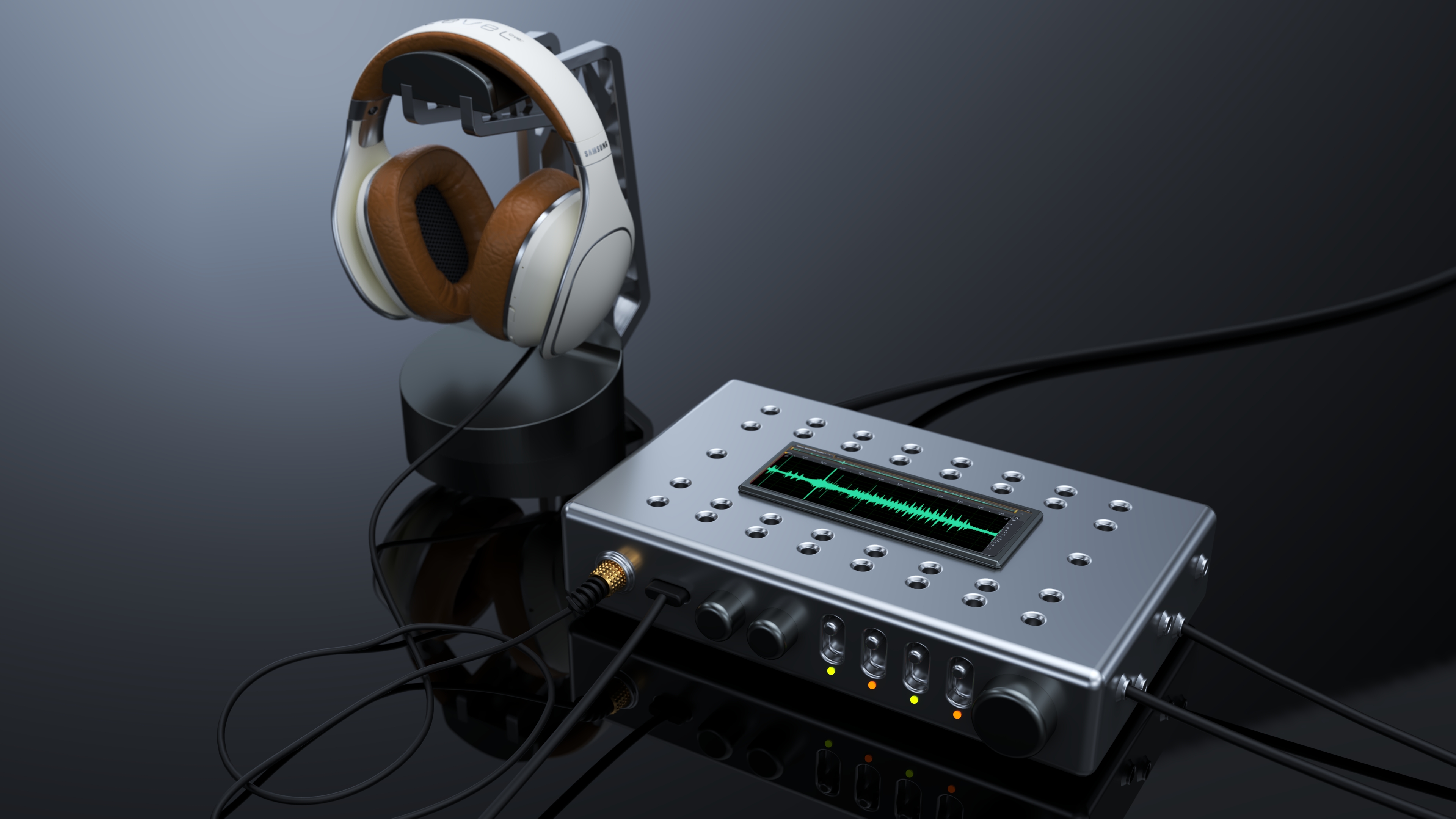 A rendering of my headphone DAC/Amp on a desk setup. Featuring the Pro-Ject Audio Debut Carbon turntable, the Samsung Level Headphones, the Apple iPad Pro 11-inch, the M-Audio BX5-D2, the Roche Bobois FURTIF Large Desk, and a MIDI keyboard that I designed.