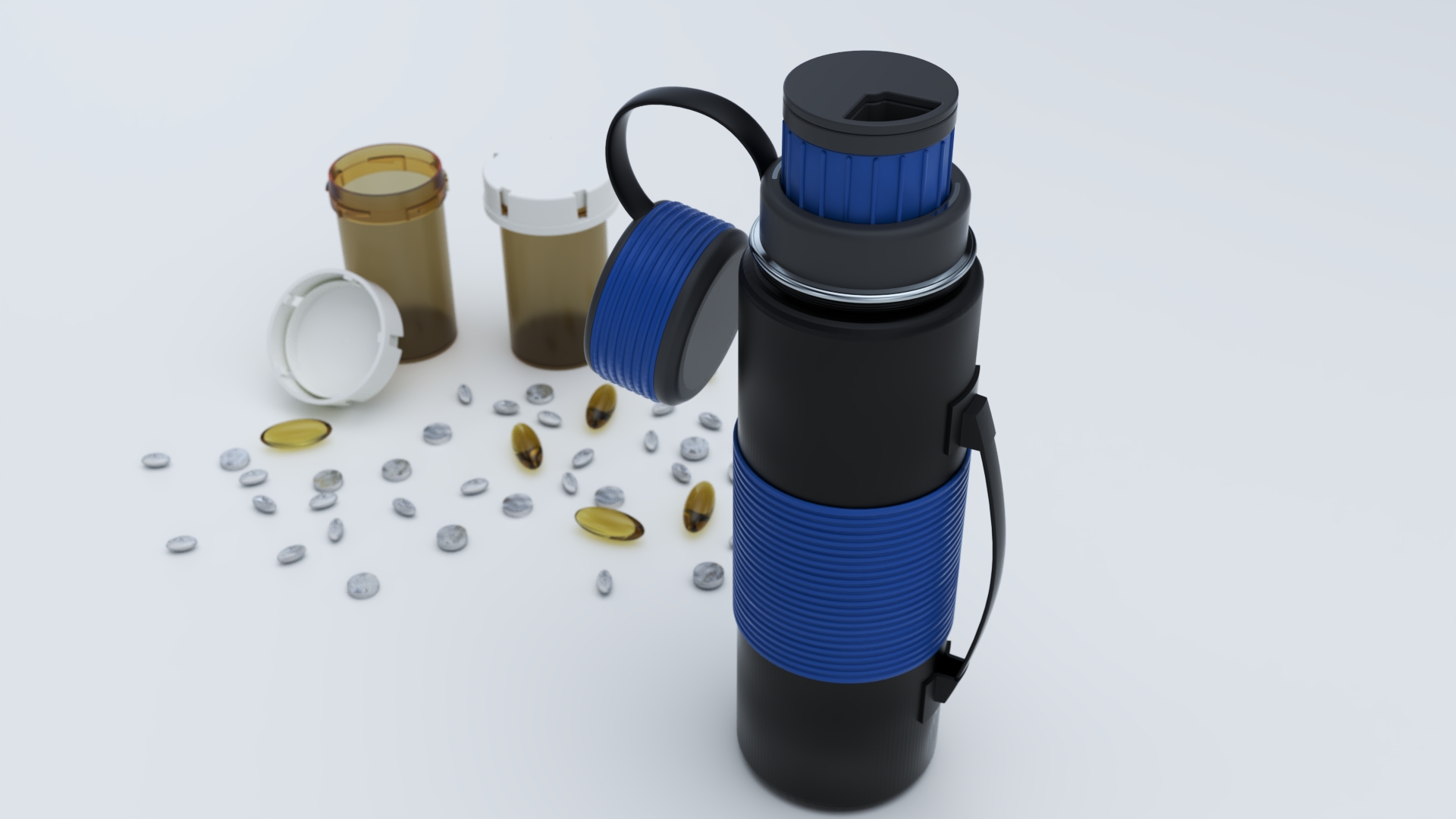 A concept for a water bottle with an integrated pill box. Added features to increase ease of use for those with arthritis.