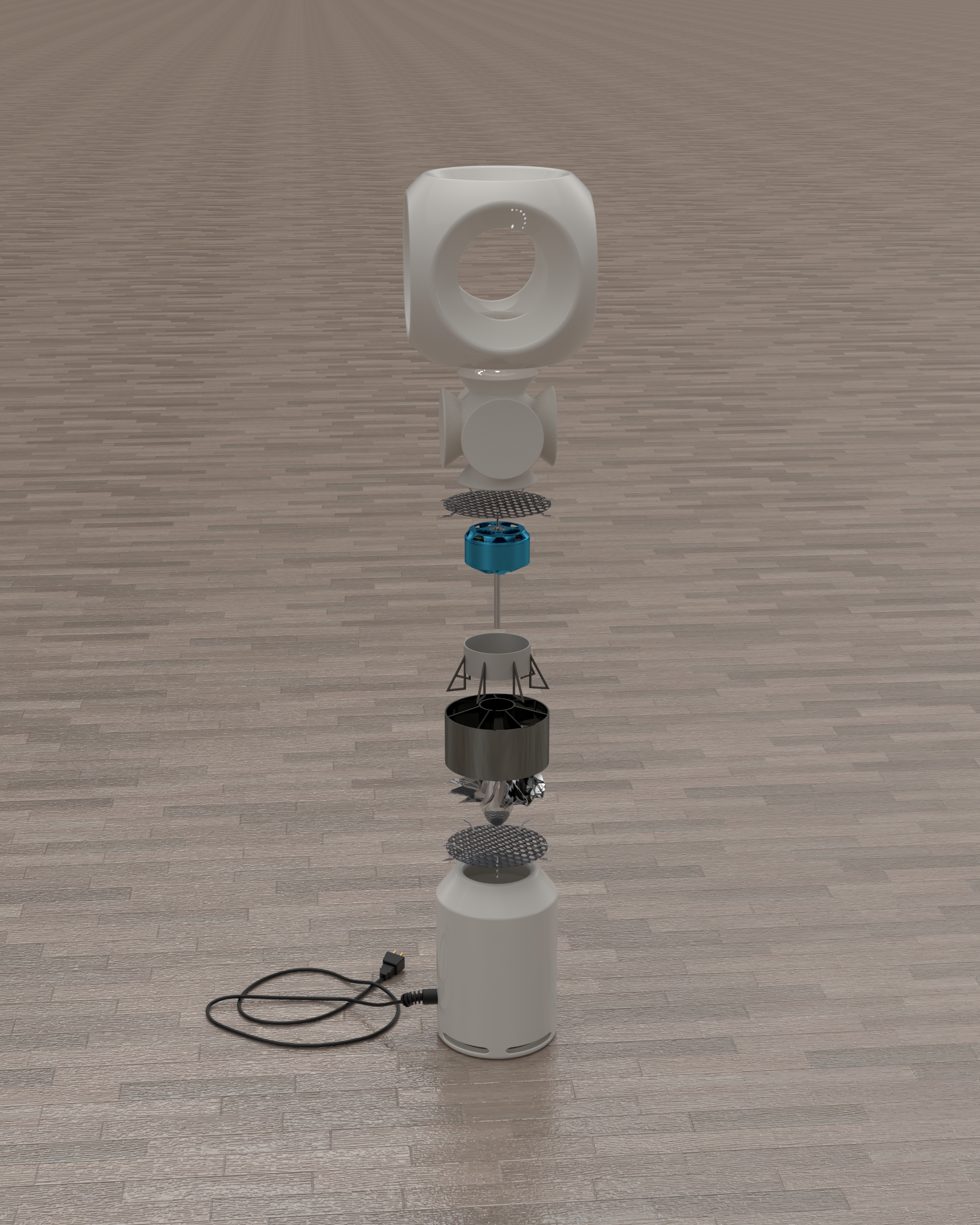 A concept for a bladeless 360-degree fan. Rendered in assembled and exploded views. Includes touch controls to change fan speed and temperature. Inspired by Dyson's bladeless fan.
