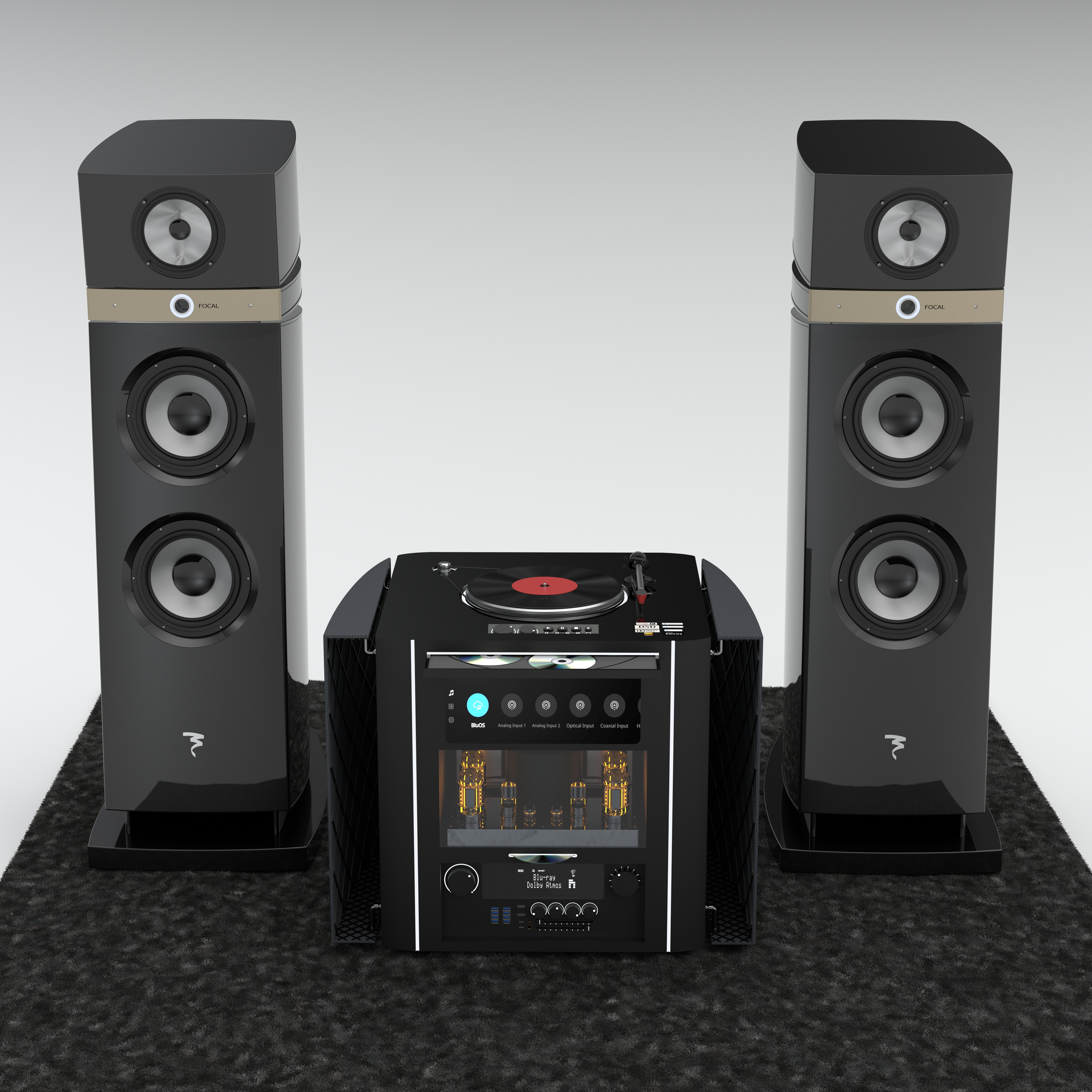 Introducing the SoundCube - 8 cubic feet of the highest fidelity audio. With 8 separate mid-range drivers and a 12-inch subwoofer, as well as a built in turntable, network streamer, CD carousel, Blu-ray player, hybrid tube and solid-state amp and a HiFi DAC, the SoundCube can play just about anything.