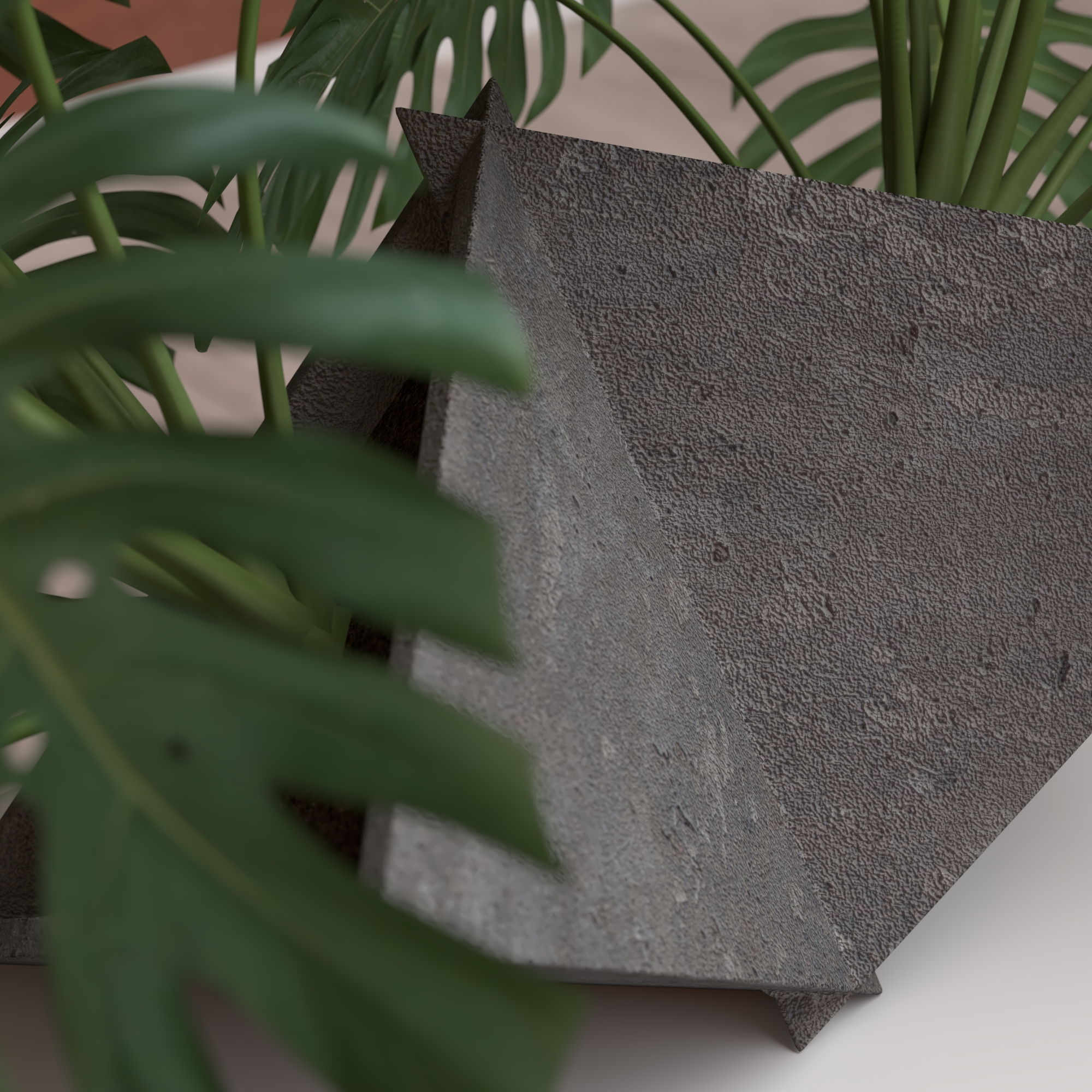 My submssion for Render Weekly S6W5: make a form from two primitive objects. Designed, modeled, and rendered a concrete planter from two shelled pyramids boolean added together.